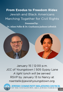 On Thursday, January 15, CJHS director Dr. Adam Fuller will give a co-talk at the  Jewish Community Center of Youngstown as a lunch and learn. The talk, titled “From Exodus to Freedom Rides: Jewish and Black Americans Marching Together for Civil Rights” will address the relationship between Jewish and African American civil rights movements, particularly in the 1960s. The event is sponsored by the Jewish Community Relations Council in commemoration of Martin Luther King Jr. Day.